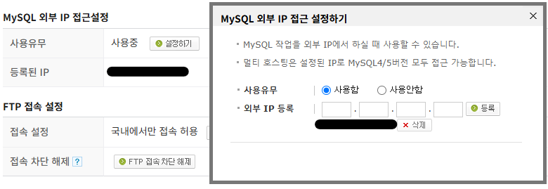 사용유무 : 사용중 옆에 설정하기 버튼을 눌러, 기존에 등록한 사용하지 않는 외부 IP를 삭제하고 새로 등록해줬다.