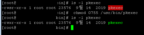 취약점 임시조치를 위해 권한 변경으로 인해 chmod 0755 /usr/bin/pkexec