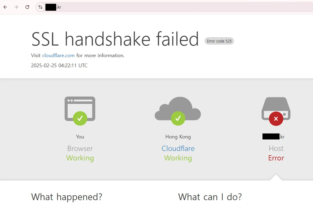 7. 웹사이트 접속해보니, SSL handshake failed Error code 525가 발생했다고 뜬다.